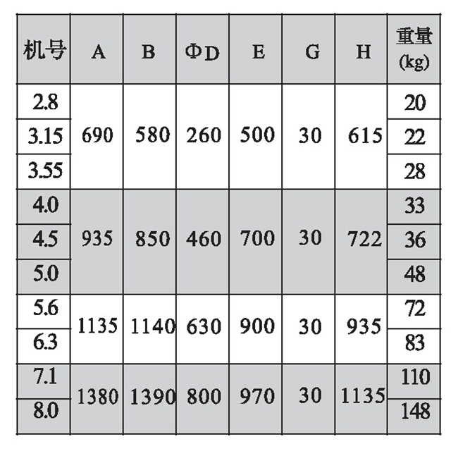 三、DWT-Ⅲ型風機外形及基礎尺寸表(單位: mm)