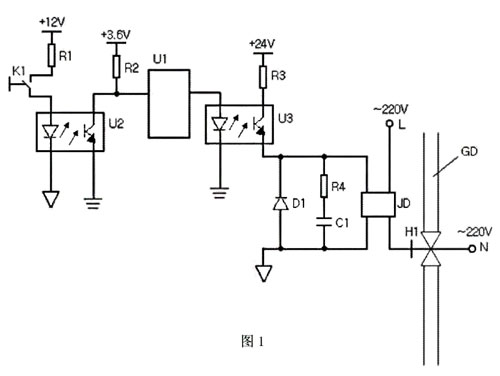 所述第二光耦U3的負輸入端接地,其正輸出端經另一分壓電阻R3接24V正電源,其負輸出端串接繼電器.JD的線圈到地。